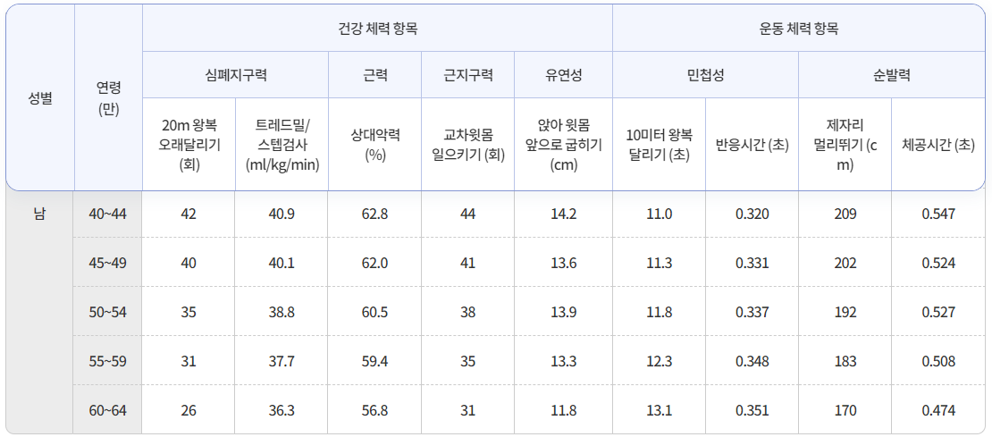 - 운동체력-민첩성(10m 4회 왕복 달리기. 반응시간), 순발력(제자리멀리뛰기. 체공시간)
